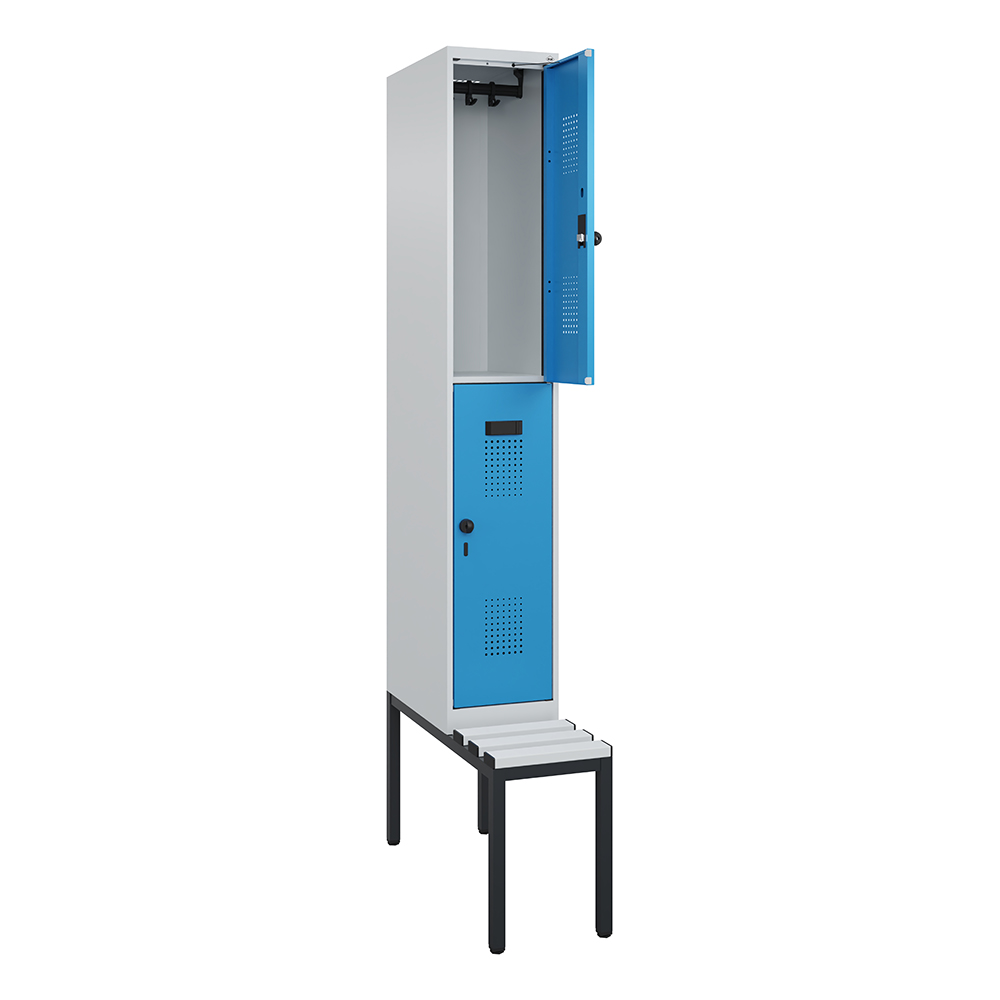 Der verzinkte Schrankboden erhöht den Korrosionsschutz, sodass der Spind auch in feuchten oder stark beanspruchten Umgebungen eine lange Lebensdauer bietet. Untergebaut ist eine Sitzbank aus stabilem Vierkantstahlrohr mit Buchenleisten/Kunststoff, ausgestattet mit verstellbaren Bodengleitern, die einen einfachen Niveauausgleich ermöglichen und gleichzeitig den Boden schonen.