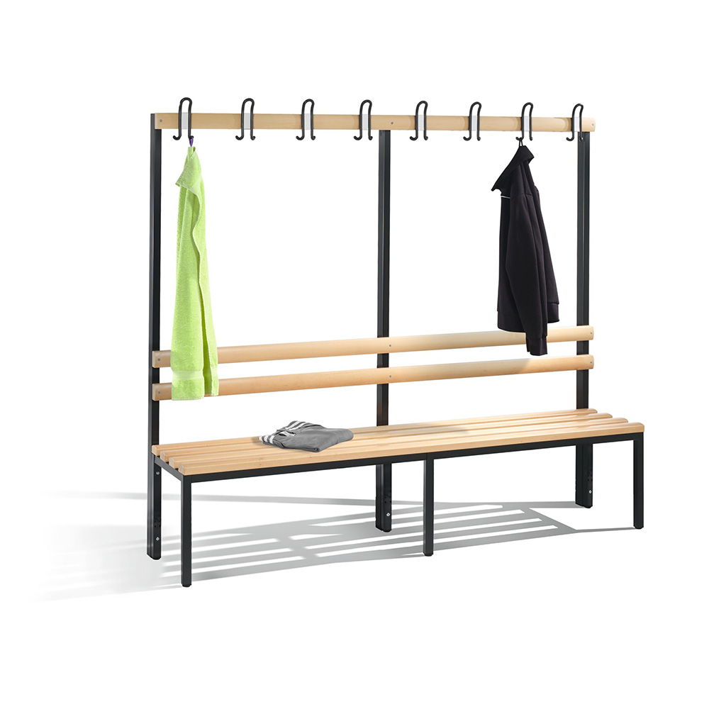 4-Fuß-GestelleSitz- und Lehnenleisten aus Holz oder KunststoffSicherheitshakenleiste mit verdeckten Kunststoff-Doppelhaken Pulverbeschichtetes Vierkantrohr-Gestell in schwarzgrau RAL 7021. Füße mit 10 mm Bodenausgleichsschrauben.