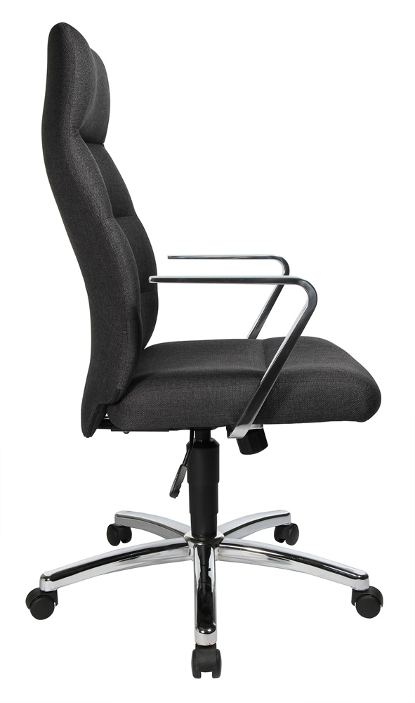 Komfortabel Synchron-Mechanik, Federkraft individuell auf das Körpergewicht einstellbar. Stabiles Stahlfußkreuz verchromt ausgerüstet mit lastabhängig gebremsten Sicherheitsdoppelrollen für Teppichböden .