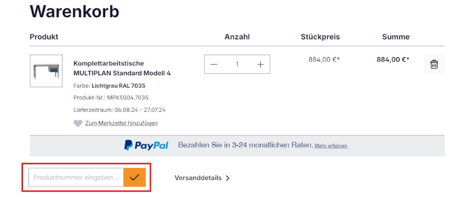 - Durch Eingabe der Artikelnummer können Produkte direkt im Warenkorb hinzugefügt werden