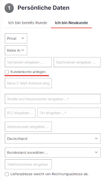 - Gehen Sie unter "Persönliche Daten" auf "Ich bin Neukunde" und entfernen Sie den Haken bei "Kundenkonto anlegen".