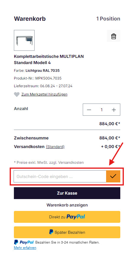 - Gutscheincode eingeben: Geben Sie unterhalb der Zusammenfassung unter "Gutschein-Code einlösen" Ihren Gutscheincode ein. Klicken Sie anschließend auf den Haken, um den Code zu aktivieren. Das Gutschein-Feld finden Sie außerdem nochmal auf der Bestellabschlussseite.