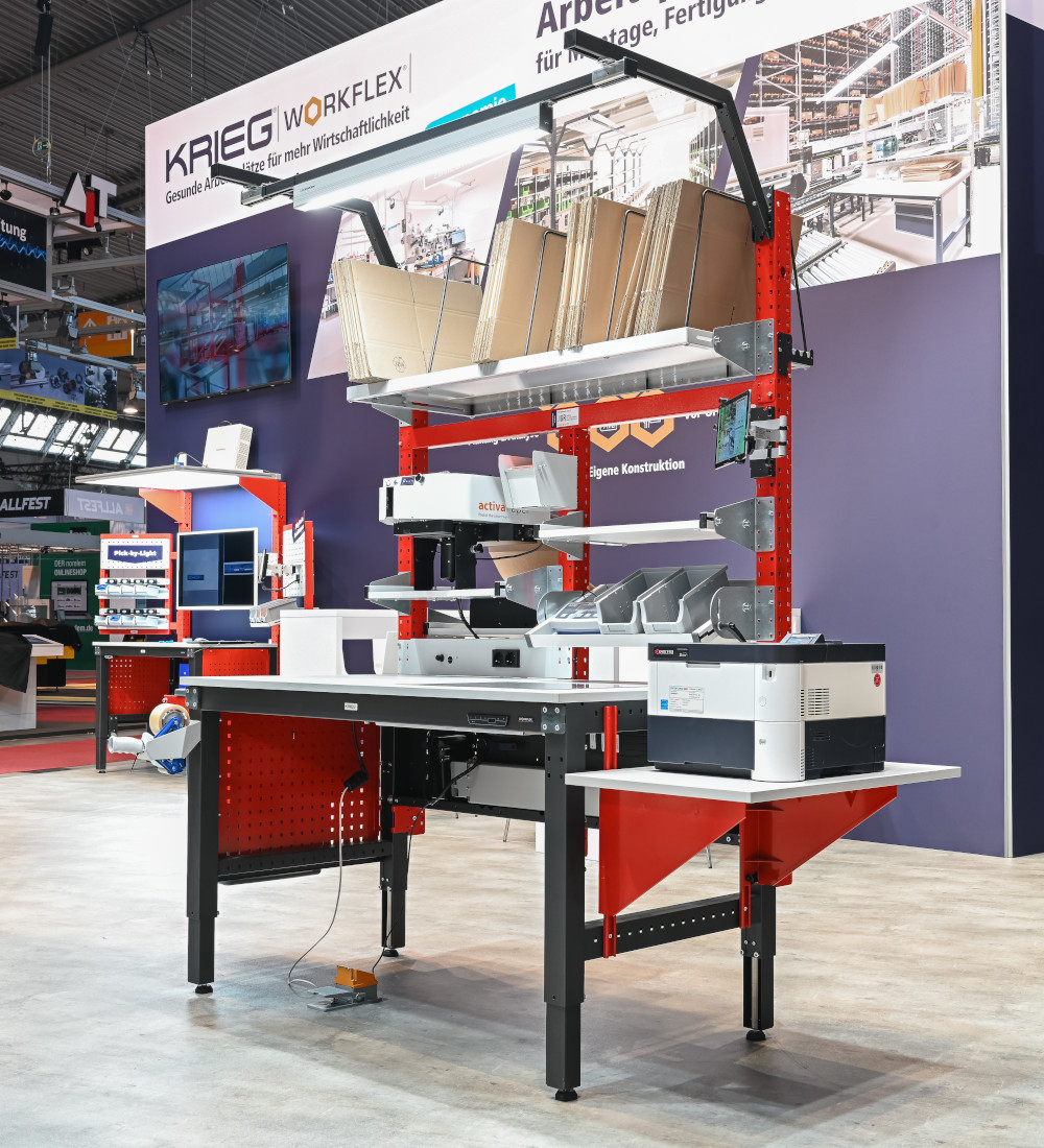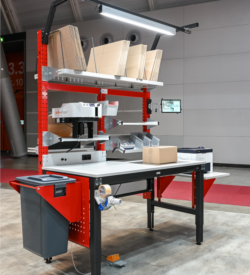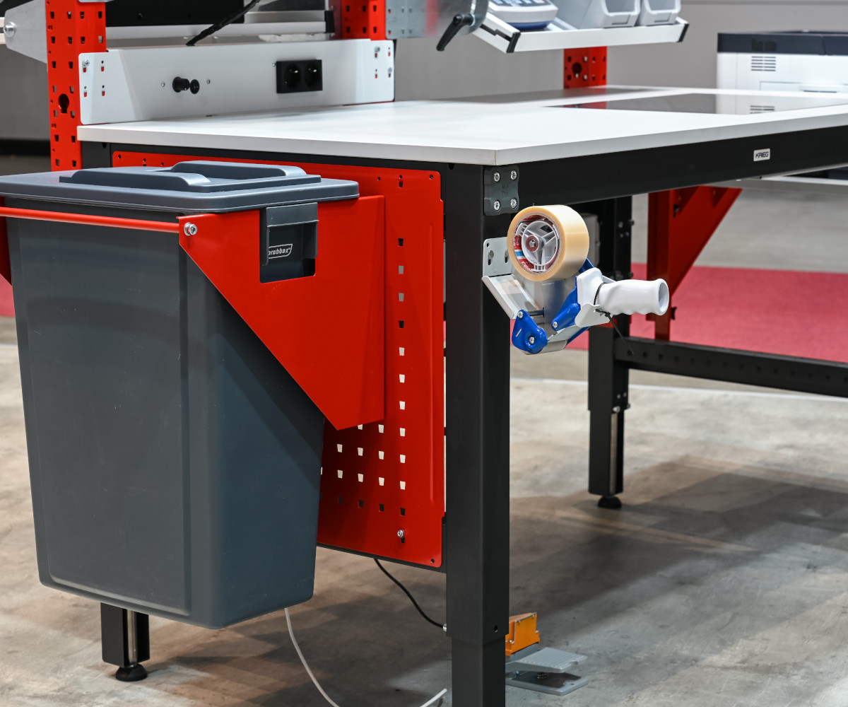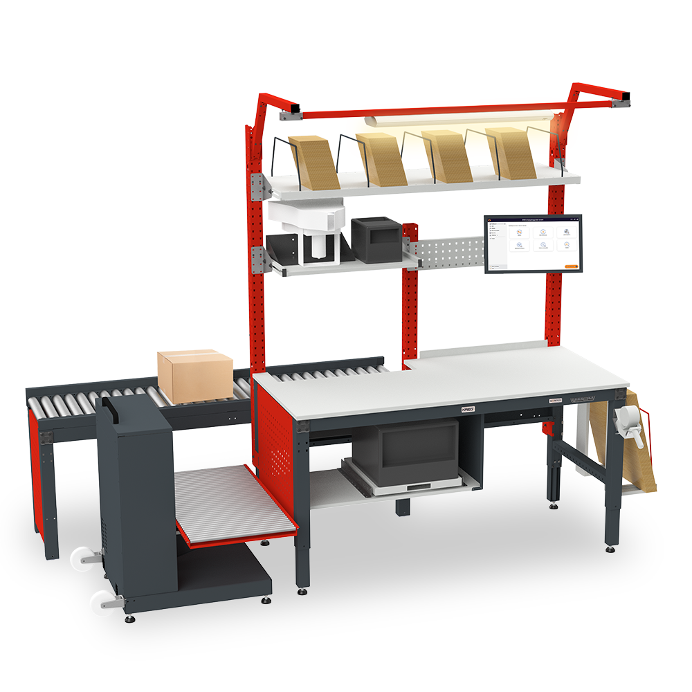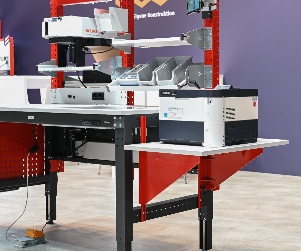 Ein Anbautisch ermöglicht die ergonomische Integration zusätzlicher Komponenten wie einer Waage oder eines Etikettendruckers am Arbeitsplatz. Er ist unabhängig vom Packtisch höhenverstellbar und lässt sich optimal an die Bedürfnisse des Mitarbeiters anpassen. Dank der integrierten Waage und der strategisch platzierten Druckeinheit können Versanddokumente bequem entnommen und Materialien effizient weiterverarbeitet werden.