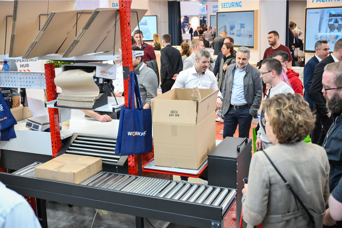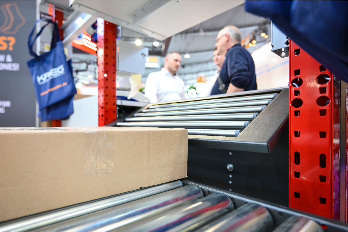 Effiziente Paketabführung durch angebaute Rollenbahn und mobilen Prozesslift