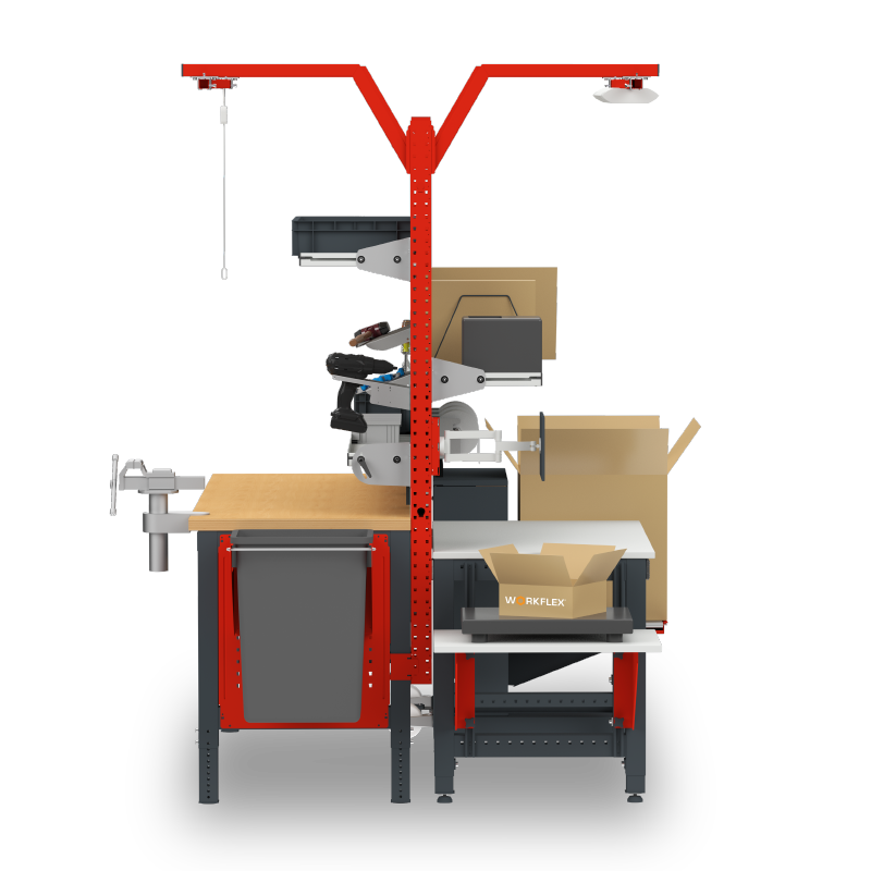 Der integrierte Prozesslift im Verpackungsarbeitsplatz MULTIPLAN, bietet eine effiziente Lösung zum schnellen Ausgleich von Höhenunterschieden, wodurch die Mitarbeiter entlastet und körperlichen Schäden vorgebeugt werden.