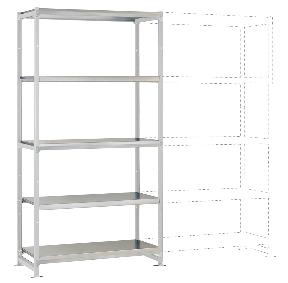 Das Regal besteht aus 5 - 7 Fachböden mit einer lichten Breite von 970 mm und einer Tiefe von 300 - 600 mm. Die Fachbodenstärke ist 40 mm. Die Fachböden sind aus glanzverzinktem Stahlblech gefertigt, extra robust mit einer glatten Oberfläche und längsseitig U-förmiger Sicherheitsabkantung. Die Fachböden können im Raster von 50 mm im Stecksystem verstellt werden (im Bereich der Querstreben im Raster von 100 mm) und lassen sich somit genau Ihren Bedürfnissen anpassen. Die Tragkraft beträgt pro Boden 100 kg bei gleichmäßiger Lastverteilung.
