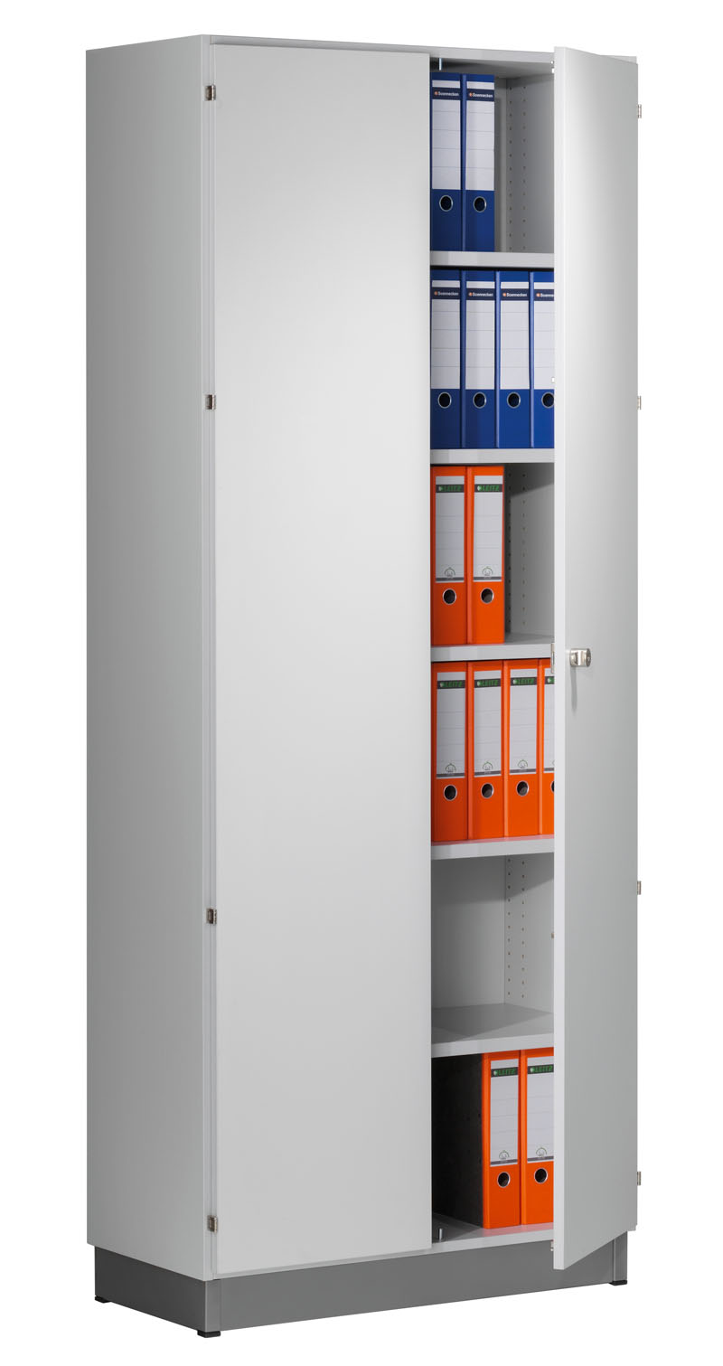 Der Flügeltürenschrank ist mit 4, 5 oder 6 Fachböden für 5, 6 oder 7 Ordnerhöhen ausgestattet, welche im 25 mm Raster höhenverstellbar sind. Durch die Fachbodenstärke von 25 mm wird ein durchhängender Boden im Falle einer starken Belastung vermieden.