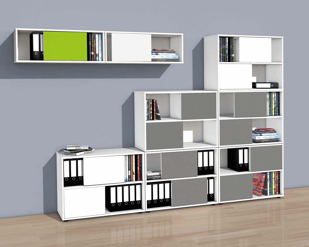 Zur Auflockerung einer Regalwand gibt es offene Anbauregale.