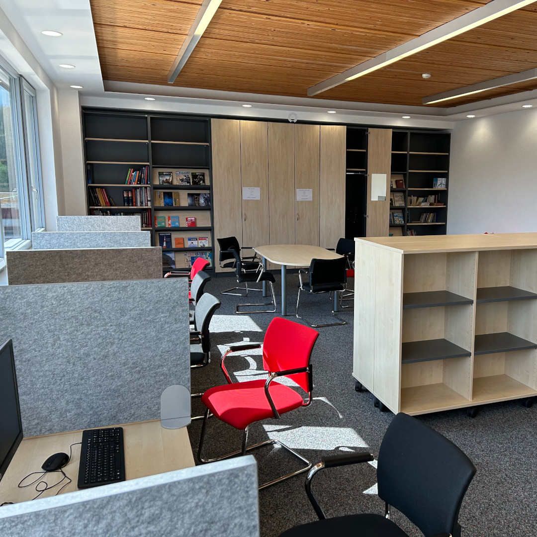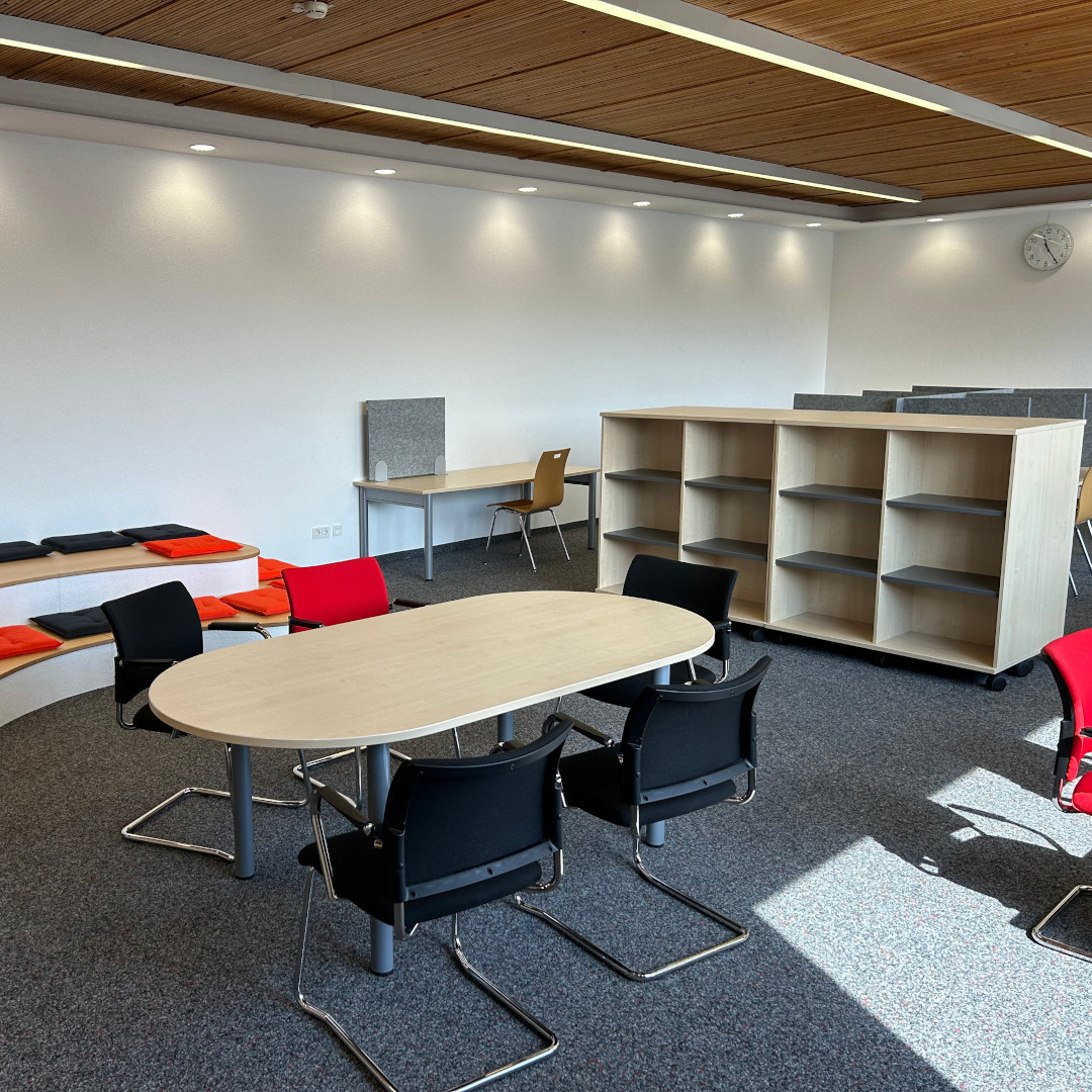 Unsere Aufgabe: Die in die Jahre gekommene Büroeinrichtung sollte durch moderne, ergonomische Lösungen ersetzt werden – inklusive Verwaltungsbüros, Aufenthaltsräume und einer neuen Mediothek.