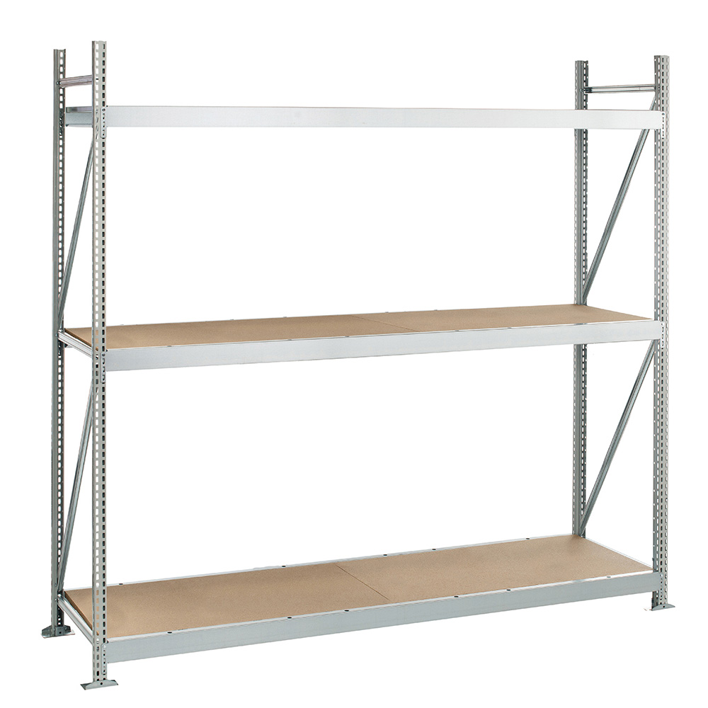 Weitspann-Komplettregal inklusive Rahmen und Fachböden. Bei den Komplettregalen sind Ständerrahmen und Traversen verzinkt, die Bodeneinlage ist aus 19 mm starker Spanplatte. Das Regal weißt eine Feldlast von bis zu 2500 kg auf und sind in verschiedenen Höhen, Breiten und Tiefen erhältlich.